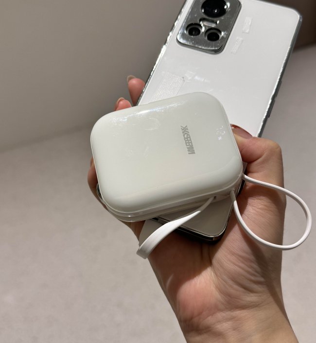 很多快充充电宝在快充时都会发热,这一点容易让人担心电池和设备受损,但西圣PBS 配备了NTC温控阵列+ MPC 智能控温算法,同时内部也有不错的散热设计。在实际充电过程中,我很少感觉到明显发热,能保持比较稳定的温度,这种体验比起很多只看快充数值不管控温的产品要可靠得多。整个充电宝便携性也很强,尺寸只有 60×74.5×28.4mm,重量大约175g,不管是放在包里还是拿在手上几乎没有太大的一个感觉。自带双接口线,出门省事