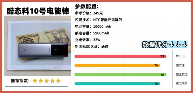 8:酷-态科10号电能棒 综合评分:87+充电效率:★ ★ ★安全性:★ ★ ★酷态科这款充电宝是10000mAh的,日常使用来说完全够用,但它的价格在两百多,算是同容量中偏贵的一款,适合预算充足的朋友选择。一个亮点是它的TFT数字彩色显示屏,不仅能实时显示电量、功率、电压、电流等信息,还可以自定义亮屏设置,可以选择常亮或者60秒后自动关闭,用起来还是比较人性化。整个充电宝机身仅重240克,体积还算是小巧,方便放进包里或口袋,但它只有两个USB输出接口,这对于同时充电多个设备的用户来说,可能略显不够用。而且数据线的管理也稍显麻烦,可能需要一些小技巧来整理。不过,总体来说,它是款兼具实用和高端感的小巧充电宝。