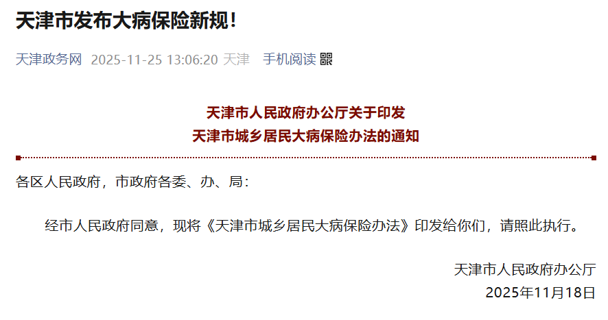 近日,天津市人民政府办公厅印发《天津市城乡居民大病保险办法》(以下简称《办法》)。《办法》明确:
