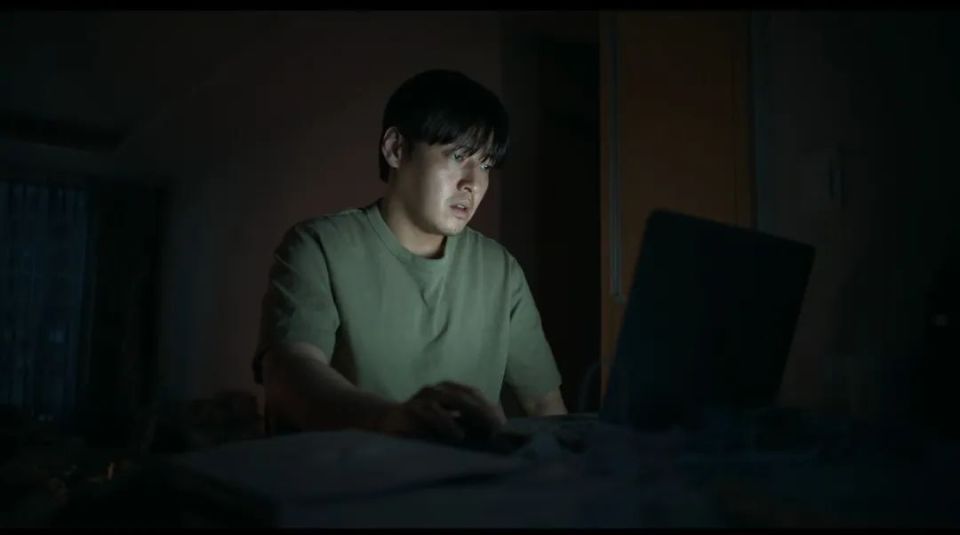 整体来说,影片的前半部分现实质感拉满,男主角从白天坐办公室打工,到晚上骑车送外卖,再到躺在压抑的公寓房间里对着手机、电脑光线熬夜,听着隔着墙壁传来的噪音辗转反侧……生活的种种疲惫侧面,都能让城市里的打工人感同身受。
