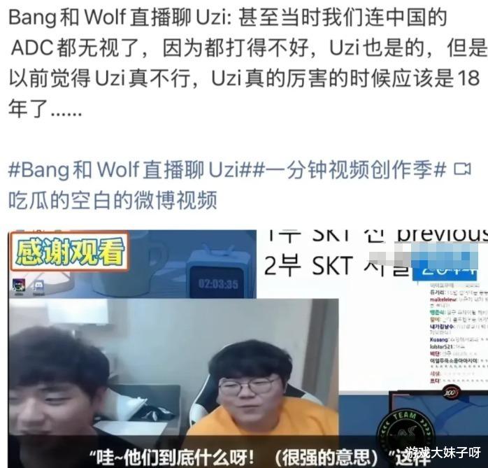 而在赛场之外,话题同样火药味十足,Bang和Wolf在近期直播中,聊到了他们对AD选手的看法,话说得相当直白,甚至可以说毫不留情,他们表示,在巅峰时期,自己几乎无视了其他赛区的ADC,包括中国赛区,因为“打得都不好”,并点名Uzi,认为当年的他是真不行,真正厉害的阶段更接近S8。