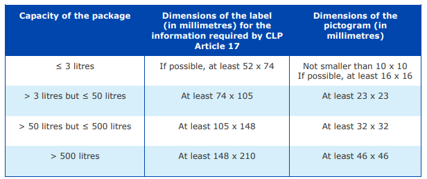 根据CLP法规及相关指南,对于不同包装容量的产品,标签总面积及每个象形图尺寸的要求不同。CLP标签(包含CLP法规要求的全部信息)及每个象形图的最小尺寸要求如下: