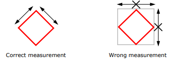 《分类、标签和包装(CLP)法规》(EC) No 1272/2008对危险象形图的形状、颜色和尺寸有明确规定。根据CLP Guidance ,标签的颜色和呈现方式必须使危险象形图清晰可见。当标签水平阅读时,危险象形图的形状为白色背景的红色菱形(见CLP法规附件I第1.2.1节)。每个象形图应占标签总面积的1/15以上,且每个象形图面积不得小于1平方厘米。需要注意的是,这里的尺寸指的是象形图红色边框的长度,而非包含边框的整个正方形的长度。下图展示了象形图的正确测量方式: