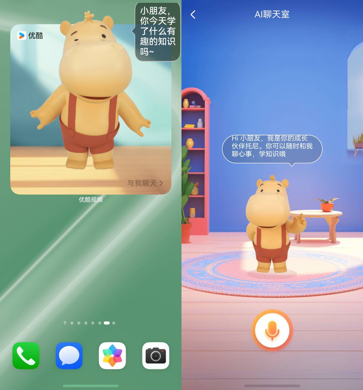 不只是社交类应用,影音类应用的互动卡片也同样亮眼,鸿蒙版优酷视频的互动卡片就让我印象深刻。卡片上有一个3D河马,立体感十足,轻轻一点它就会挥手或者跳跃,并且还会有文字上的互动。点击右下角的“与我聊天”后,就能进入少儿频道的陪伴功能,可以让孩子通过语音进行互动。卡片有三种尺寸可选,可以根据桌面空间随心添加。