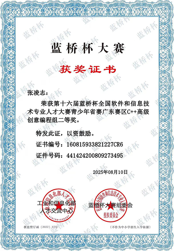 高二18班张凌志同学在第十六届蓝桥杯全国软件何信息技术专业人才大赛青少年省赛中获得广东赛区C++高级创意编程组二等奖。指导教师为余峻展。