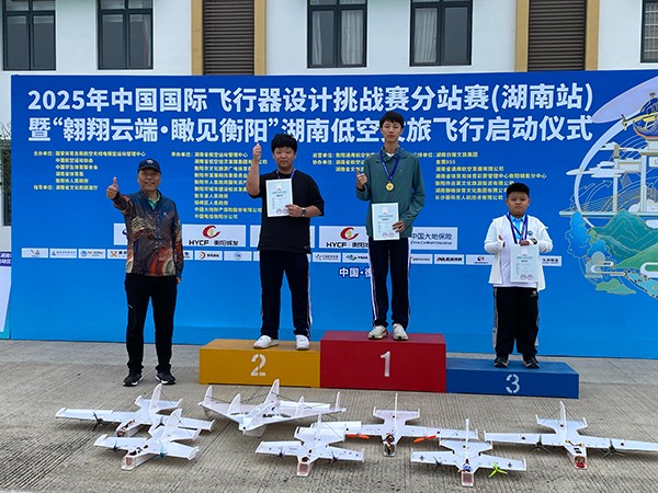 在由国家体育总局航空无线电模型运动管理中心主办的2025年中国国际飞行器设计挑战赛中,我校航模社团的同学高一8班的朱俊杰,高一29班的陈祺峰,高一8班的朱小东,分别获得了两个冠军,两个亚军,一个季军,五个单项一等奖,一个单项二等奖,三个团体第一名。