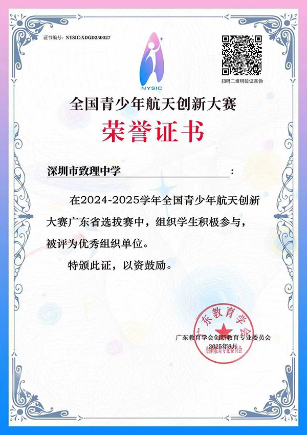 在2024-2025学年全国青少年航天创新大赛广东省选拔赛中,我校获得2个一等奖、2个二等奖的好成绩,其中一支队伍获得广东省冠军。深圳市致理中学被评为优秀组织单位,余峻展被评为优秀指导教师。