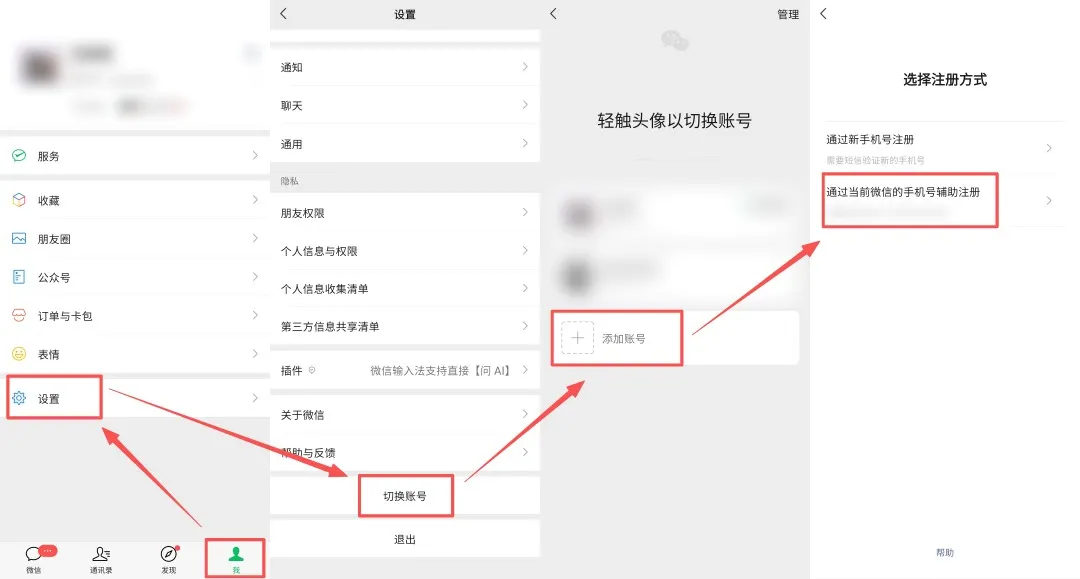 1、启动注册:打开微信,依次点开右下角的【我】 → 进入【设置】 → 找到并点击【切换账号】 → 选择【添加账号】 → 最后点击【通过当前微信的手机号辅助注册】,就正式开启注册流程了。