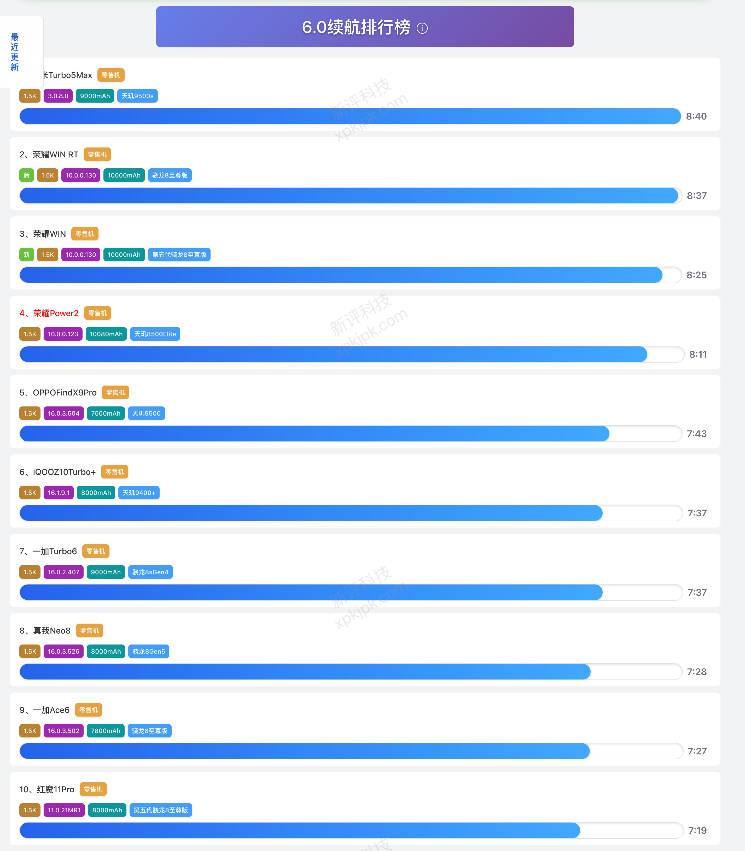 这次续航TOP10机型来自新评科技的6.0续航排行榜,里面的机型都是零售机,因此相对消费者来说更加具有参考意义。