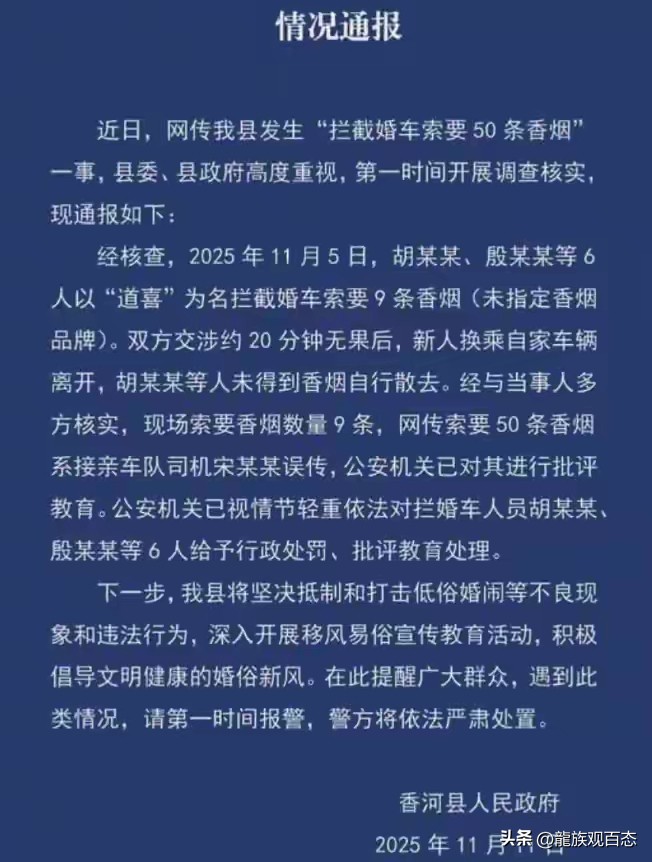 5、通报中着重强调,拦车人索要的香烟数量是9条,50条是婚车司机的误传。