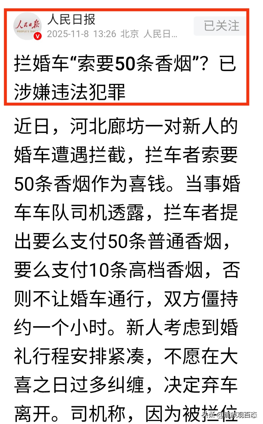 拦婚车索要财物,是讨喜?还是犯罪?甚至导致新郎新娘弃昏车而去,性质如此恶劣,还能被容忍吗?连人民日报都看不下去,上场发声,给这种恶劣行为定性。