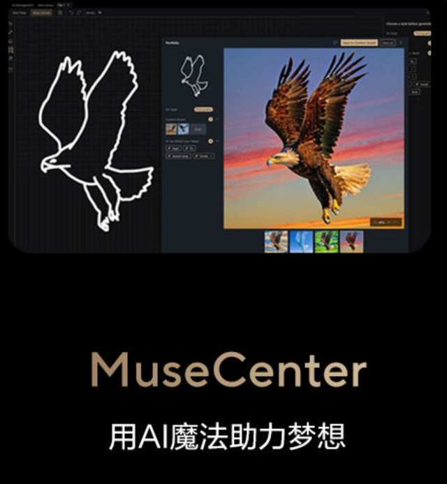 此外,深度适配创作软件的创意旋钮让创作操作更高效,AI驱动的MuseCenter能生成灵感、整合跨界创意,让分散的探索,沉淀为可落地的系统化创作成果。