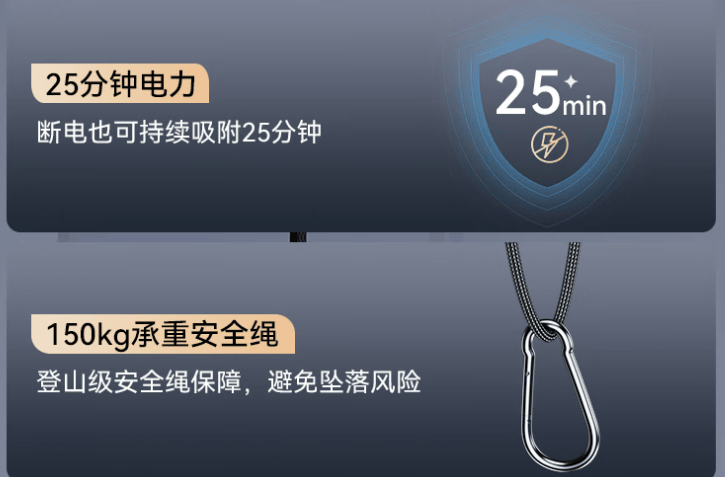 高层用户不用再冒险伸手擦窗,安全绳、断电吸附、警报提示等功能让机器即使断电也能保持吸附,防掉落风险,大大降低意外发生概率。