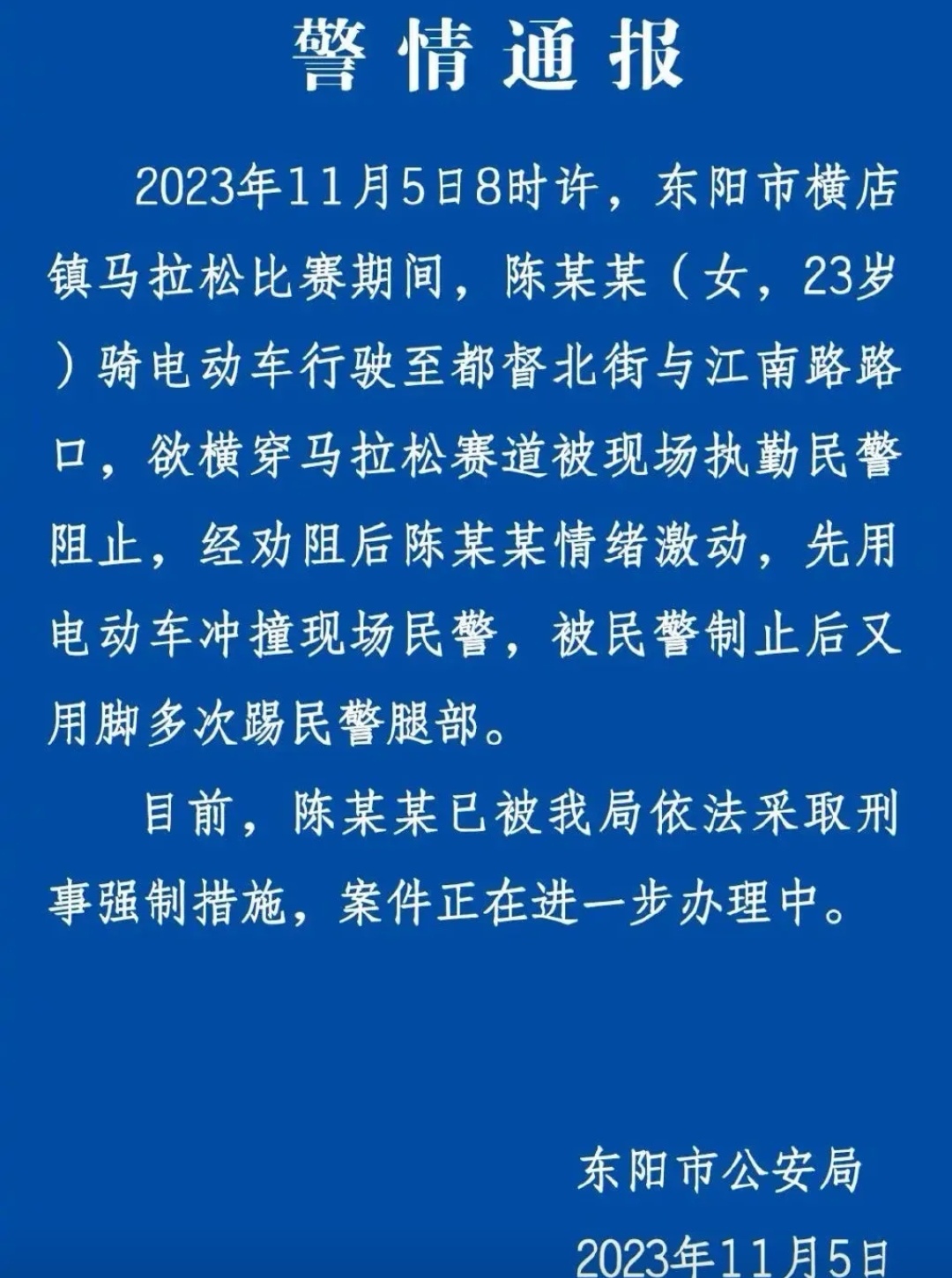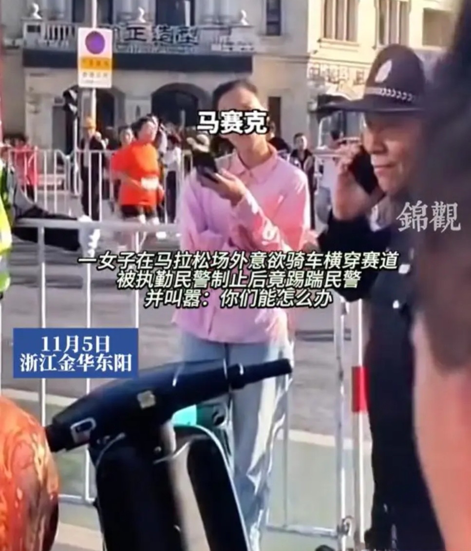 当时是东阳市横店镇马拉松比赛期间,一女子骑电动车行驶至都督北街与江南路路口,欲通过马拉松赛道被叔叔阻止。经劝阻后女子情绪激动,先用电动车冲撞执勤叔叔,被叔叔制止后又用脚多次踢叔叔腿部。