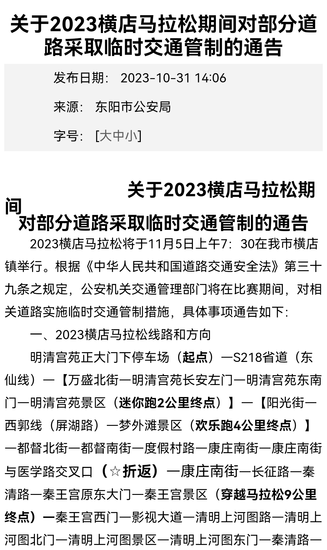 在10月31日已经发布了,关于2023横店马拉松期间对部分道路采取临时交通管制的通告。通告里面详细地标注了,部分道路的管制时间。