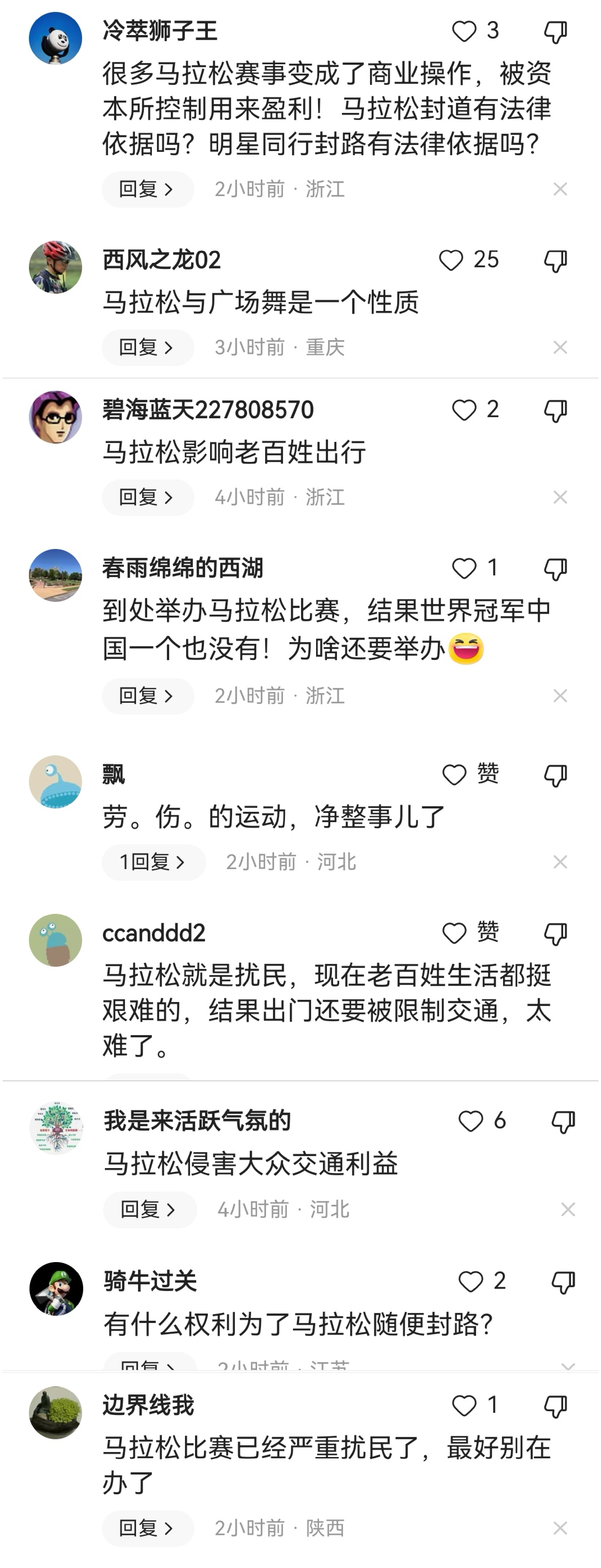 有人则认为马拉松比赛影响市民出行,不应该随便封路。不建议在办马拉松比赛。