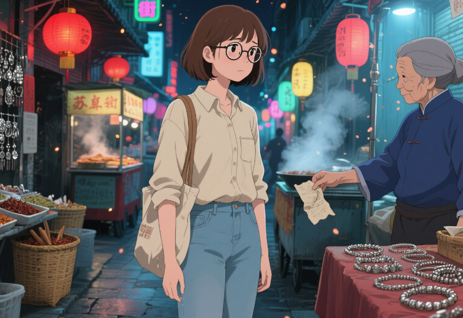 草牙街果然名不虚传。狭窄的巷道被两侧的摊棚挤得满满当当,头顶纵横交错的电线挂满了闪烁的彩灯和小灯泡,投下明明灭灭的光晕。空气是复杂的交响:烤豆腐焦香混着辣子面的冲劲,新鲜水果的清甜裹着不知名香料的奇异芬芳,鼎沸的人声里夹杂着讨价还价的方言俚语。我像一滴水汇入奔腾的溪流,漫无目的地游荡,手指滑过粗糙的扎染布、冰凉的翡翠挂件、叮当作响的苗银头饰……视线被角落一个不起眼的摊位黏住。没有招牌,没有吆喝,一盏孤零零的白炽灯泡悬在竹竿上,照亮一方小小的天地。摊主是个上了年纪的老妇人,穿着洗得发白的深蓝色土布斜襟衫,头发在脑后挽成一个紧实的髻。她枯瘦得像一截沉默的老树根,盘腿坐在一张磨得油亮的草席上。她面前只铺着一块靛蓝色的粗布,上面零星摆着几件银饰,造型古拙,带着岁月摩挲后的温润光泽。不像其他摊主那般热切招揽,她只是低着头,布满褶皱和老茧的手指,一遍遍缓慢地、极其专注地擦拭着其中一只宽面银镯。那专注的神态,仿佛在进行某种无声的仪式。一种奇异的静谧感笼罩着她的小摊,与周遭的喧嚣格格不入。“阿婆,这个镯子……”我蹲下身,目光被那只她反复擦拭的银镯吸引。它样式简单,宽宽的镯身,没有任何繁复的雕花,只在接口处錾刻着几个细密如藤蔓般缠绕的符号,在灯光下流淌着内敛的光华。老妇闻声,动作顿住。她极其缓慢地抬起头。当那张沟壑纵横的脸完全暴露在灯光下时,我的心毫无征兆地猛跳了一下。她的眼睛很浑浊,眼白泛着一种不健康的黄,瞳孔深处却像两口深不见底的古井。那目光,疲惫得惊人,沉甸甸的,仿佛承载着千钧重负,直直地穿透我的眼睛,落在我身后的某个虚空点上。不是在看商品,也不是在看顾客。那眼神里,有种难以言喻的悲悯和一种近乎绝望的……警示?“看看。”她的声音嘶哑干涩,像砂纸摩擦着朽木。她将那只银镯递过来。指尖相触的瞬间,一股难以言喻的冰凉感蛇一样窜上我的手臂,激得我差点失手把镯子摔了。那不是金属的凉,更像……某种没有生命的东西散发出的寒气。我强压下心头怪异的悸动,接过镯子。分量很沉,是实打实的银子。那些神秘的符号在指腹下微微凸起,触感奇异。“多少钱?”我试着问道,指尖无意识地摩挲着镯子内壁。老妇没有立刻回答。