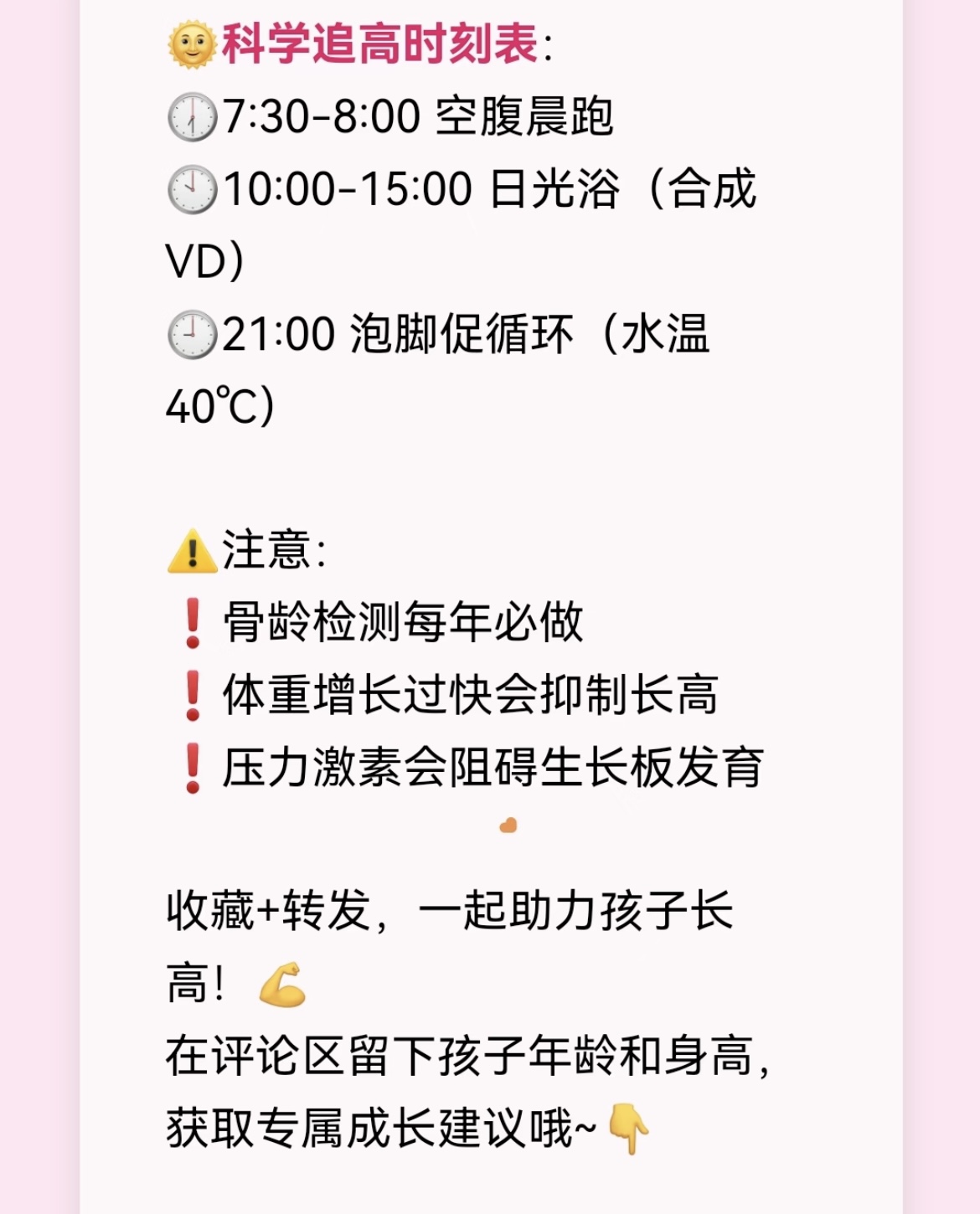 力,快乐的心情也是长高的“秘密武器”。春天多带孩子晒太阳,上午十点到下午三点的阳光最温和,能促进维生素D合成,帮钙吸收。晚上九点泡个四十度的热水脚,促进血液循环,让孩子睡得更香。