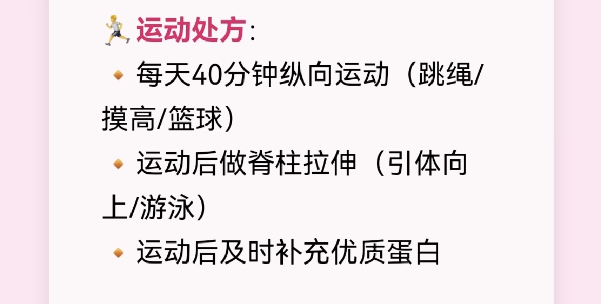 运动是长高的“助推器”,但不是所有运动都有效。纵向运动,比如跳绳、摸高、打篮球,能像拉弹簧一样牵拉骨骼,刺激生长板。每天坚持四十分钟,哪怕分成两次跳绳,也比躺着刷手机强。运动完别忘了做脊柱拉伸,引体向上、游泳都是不错的选择,能缓解脊柱压力,让孩子站得更挺拔。运动后及时补充优质蛋白,一杯牛奶或一个鸡蛋,给身体“加油”,让肌肉和骨骼一起长大。