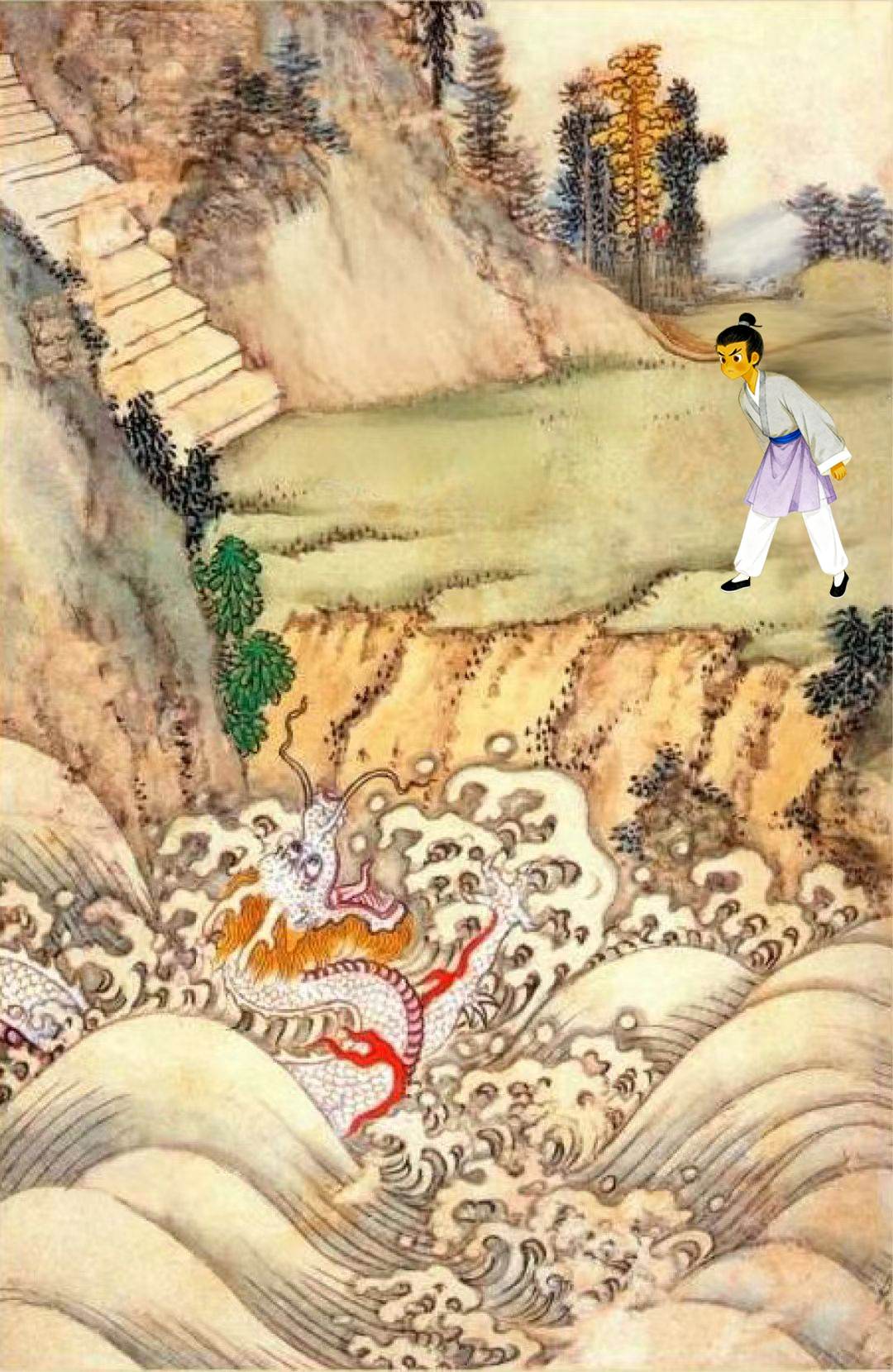 如今且说乌哥自那日离了五柳源,径直北上。忽又忖道:“世人皆言东南形胜绝妙,有那三秋桂子,十里荷花。市列珠玑,户盈罗绮。繁华如此,当前去一观。或者能在那厢安身,也未可知。”顶风冒雪,转向投东而去。途中倒也无甚挂碍,一路平稳,于那扬州城中游了一日,又早至扬州府瓜洲江边。但见:浮云暂住,江水停涛。残雪点点,古木寂寂。乌哥兀自立在江边,思虑如何过得这江水。只见“忽喇”一声,那江心中钻出个兽怪,你看他: