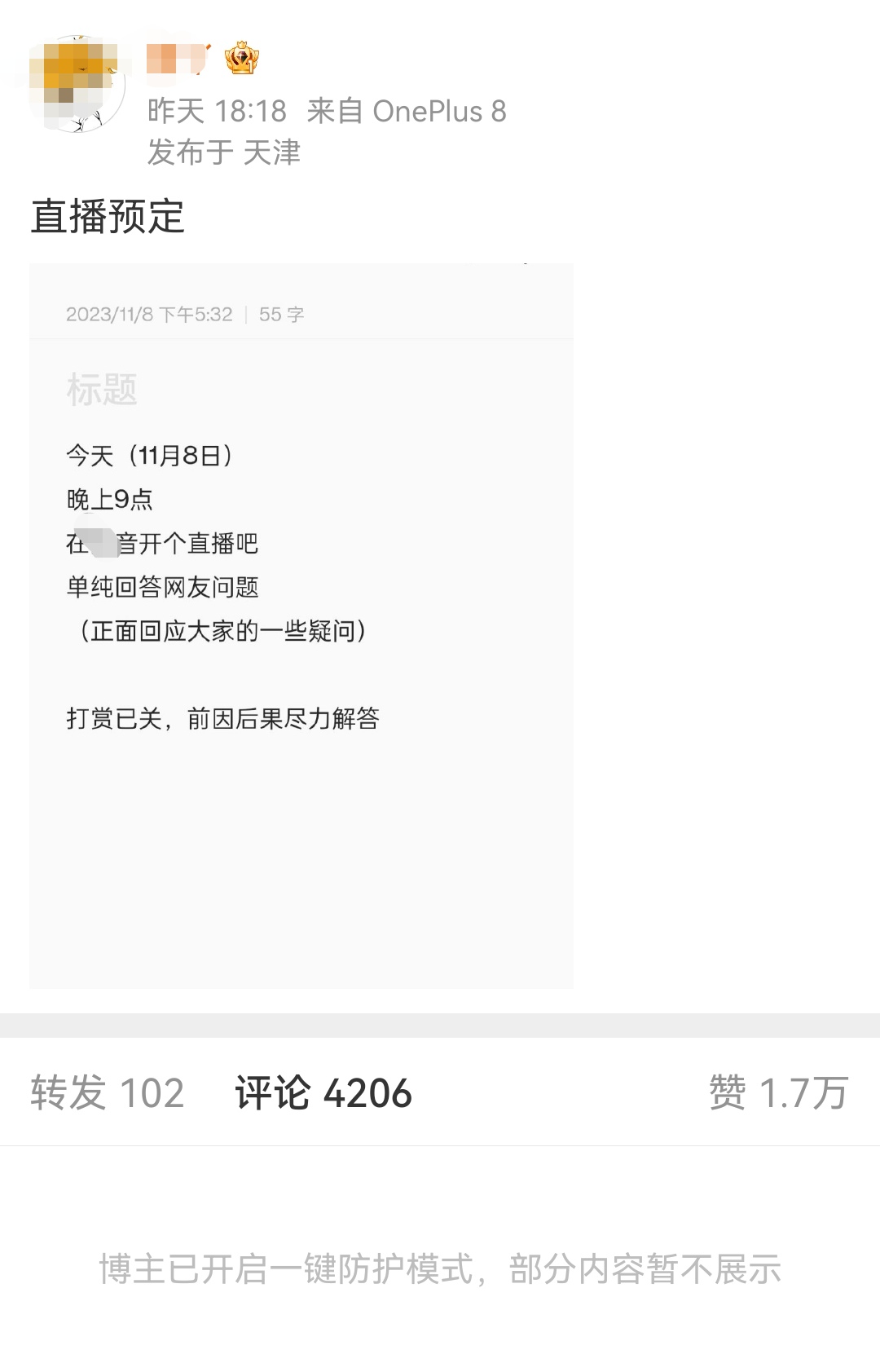 11月8号,朱同学准备再次为自己辩解,并于18时18分,发布一条直播预定通知,决定在当天晚上9点,在某音开直播,正面回应网友的问题。(同时小默注意到,朱同学某平台账号下已经开启了一键防护,禁止网友查看评论。)