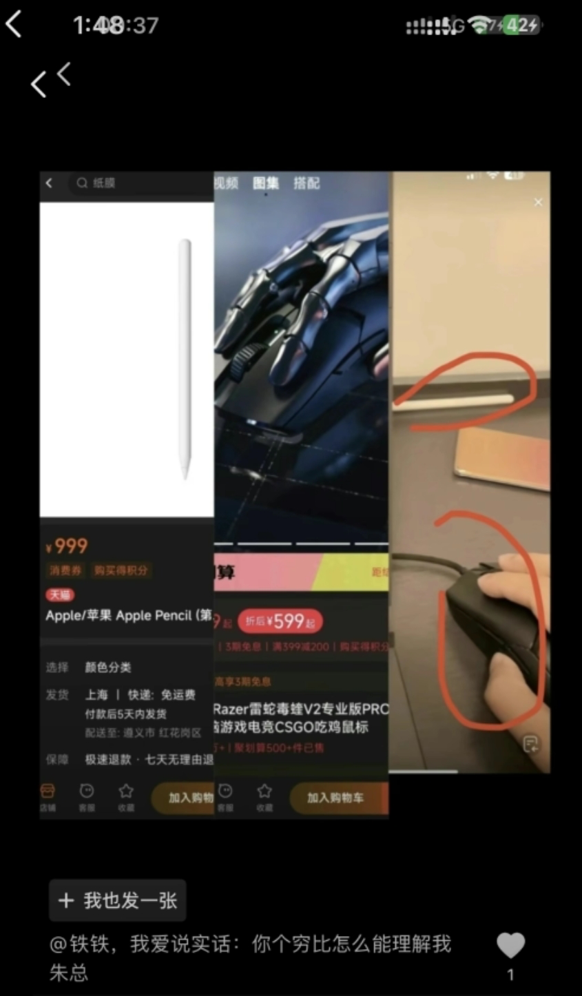 在朱同学展示他的笔记本时,他把电脑独立显卡关了只用cpu渲染,骗网友说电脑不好。细心的网友还发现了,朱同学使用的鼠标是专门用来打游戏的某宝上价格599起的Razer雷蛇毒蝰V2专业版鼠标。朱同学桌子上放着一支某宝上价格999元的apple pencil(平板电脑触控笔)。