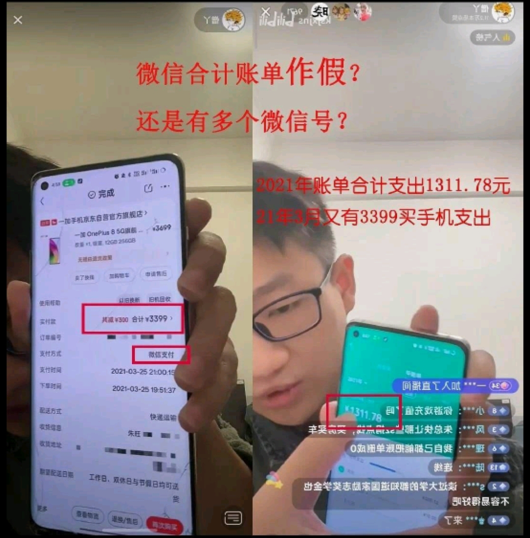 朱同学晒出他买一加手机的购买记录。图片显示2021年3月25日在某平台使用微信支付了3399元。而细心的网友又发现这和他晒出来微信2021年的账单合计支出对应不上。图片显示他微信2021年账单合计支出为1311.78元,但2021年3月他又花了3399买了一加手机。网友质疑他是把微信合计账单作了假,还是他有多个微信号?