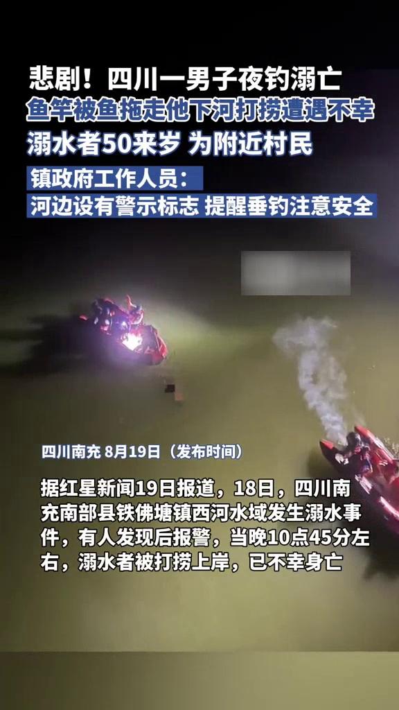 钓鱼佬钓鱼被鱼拖下水,想要去捞鱼竿,没想到溺亡了。8 月 18 日晚,四川南部县铁佛塘镇的西河边上,一位 50 来岁的村民在夜钓时,鱼竿被鱼拖进水里,他下水打捞,不幸溺亡。当晚 10 点 45 分左右,救援人员将其打捞上岸,可此时已无力回天。镇政府工作人员表示,河边设有警示标志,提醒大家垂钓注意安全。
