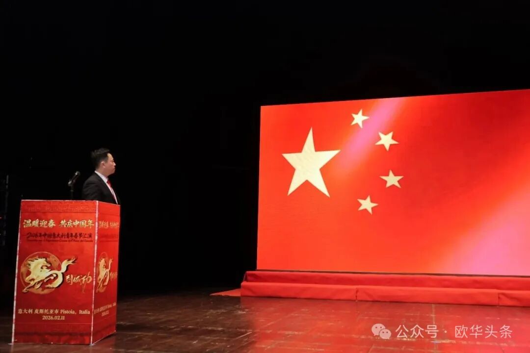 ▲活动伊始,意大利华企文化交流协会会长曹隆科代表此次活动的主办方向所有到场嘉宾致以诚挚的新春问候,感谢各界人士对本次大型演出的关心与支持,并宣布奏响中华人民共和国国歌和意大利共和国国歌,现场气氛庄重而热烈。