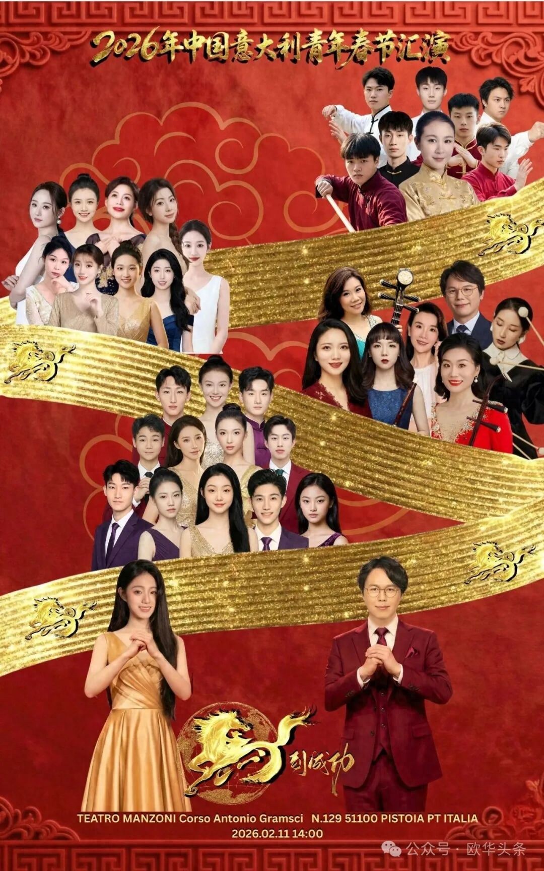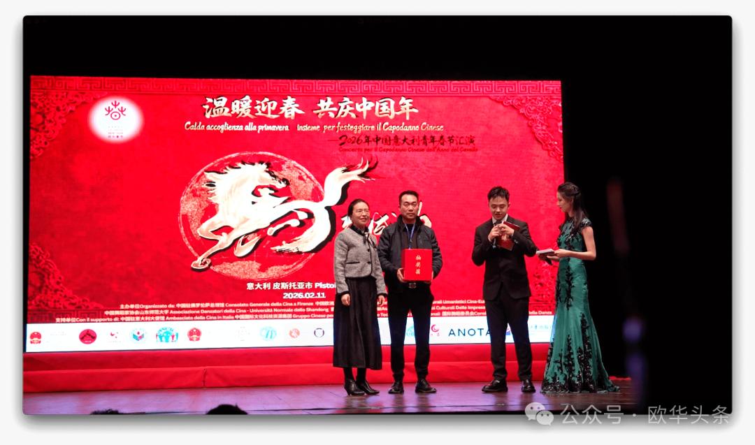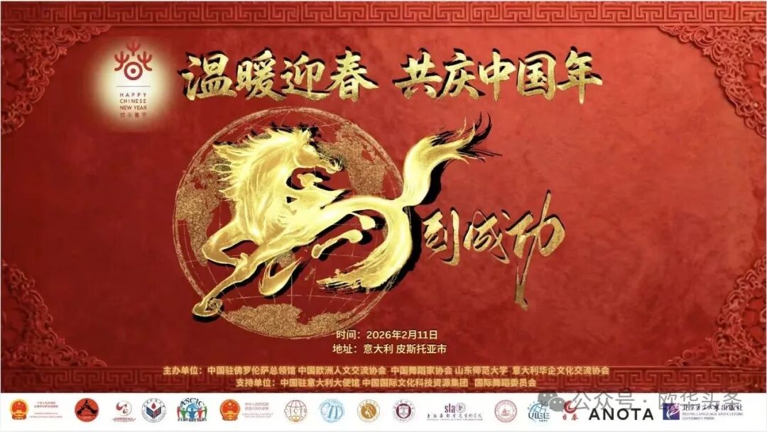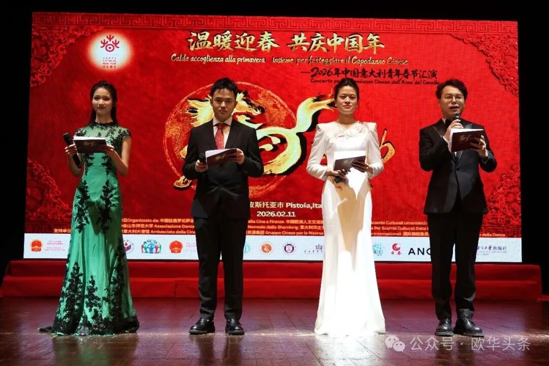 为弘扬中华优秀传统文化,丰富旅意侨胞精神文化生活,推动中意人文交流与民心相通,意大利当地时间2026年2月11日下午,由中国驻意大利佛罗伦萨总领事馆、中国欧洲人文交流协会、中国舞蹈家协会、山东师范大学、意大利华企文化交流协会共同主办,佛罗伦萨领区30多个兄弟侨团联合协办的“温暖迎春·共庆中国年”大型文艺演出,在皮斯托亚市 MANZONI 剧院隆重举行。此次活动支持单位为:中国驻意大利大使馆、中国国际文化科技资源集团、国际舞蹈委员会。