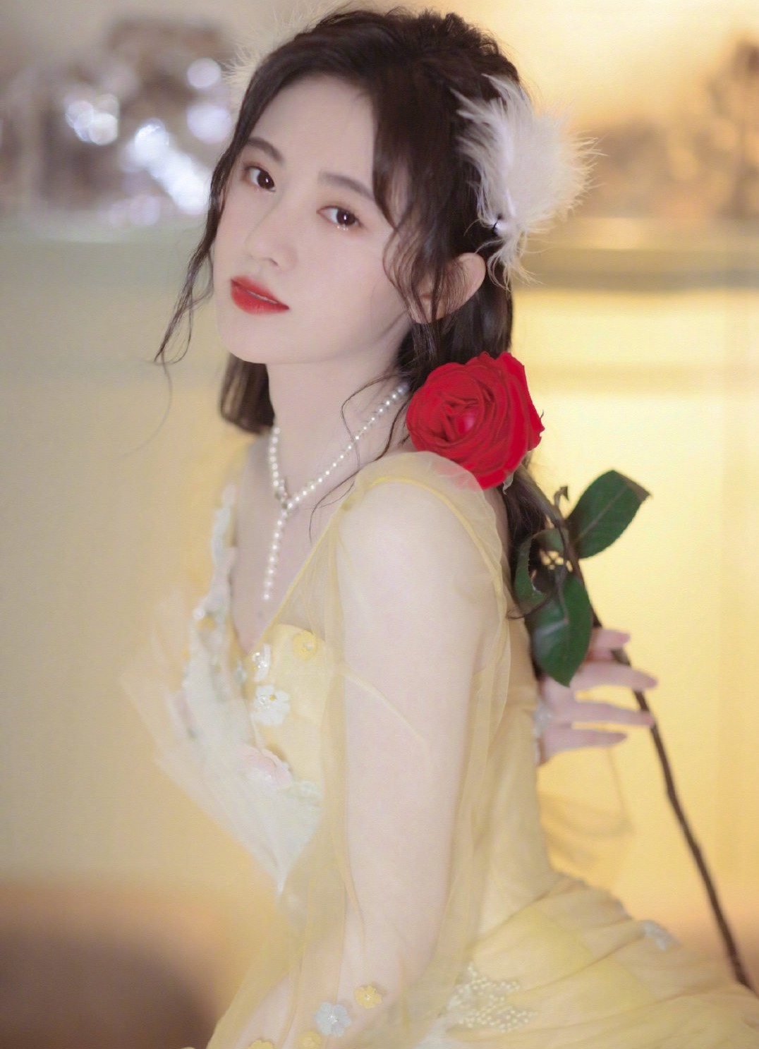 淡黄色是所有黄色中最具有少女感的,有着新生的意义,身着淡黄色纱裙的鞠婧祎,有着无与伦比的朦胧美,淡黄色和裙摆的轻盈感搭配得很和谐,而且将纱裙的浪漫元素拔高了不少。并且这个颜色对肤色要求也相对较低,具有百搭的属性。