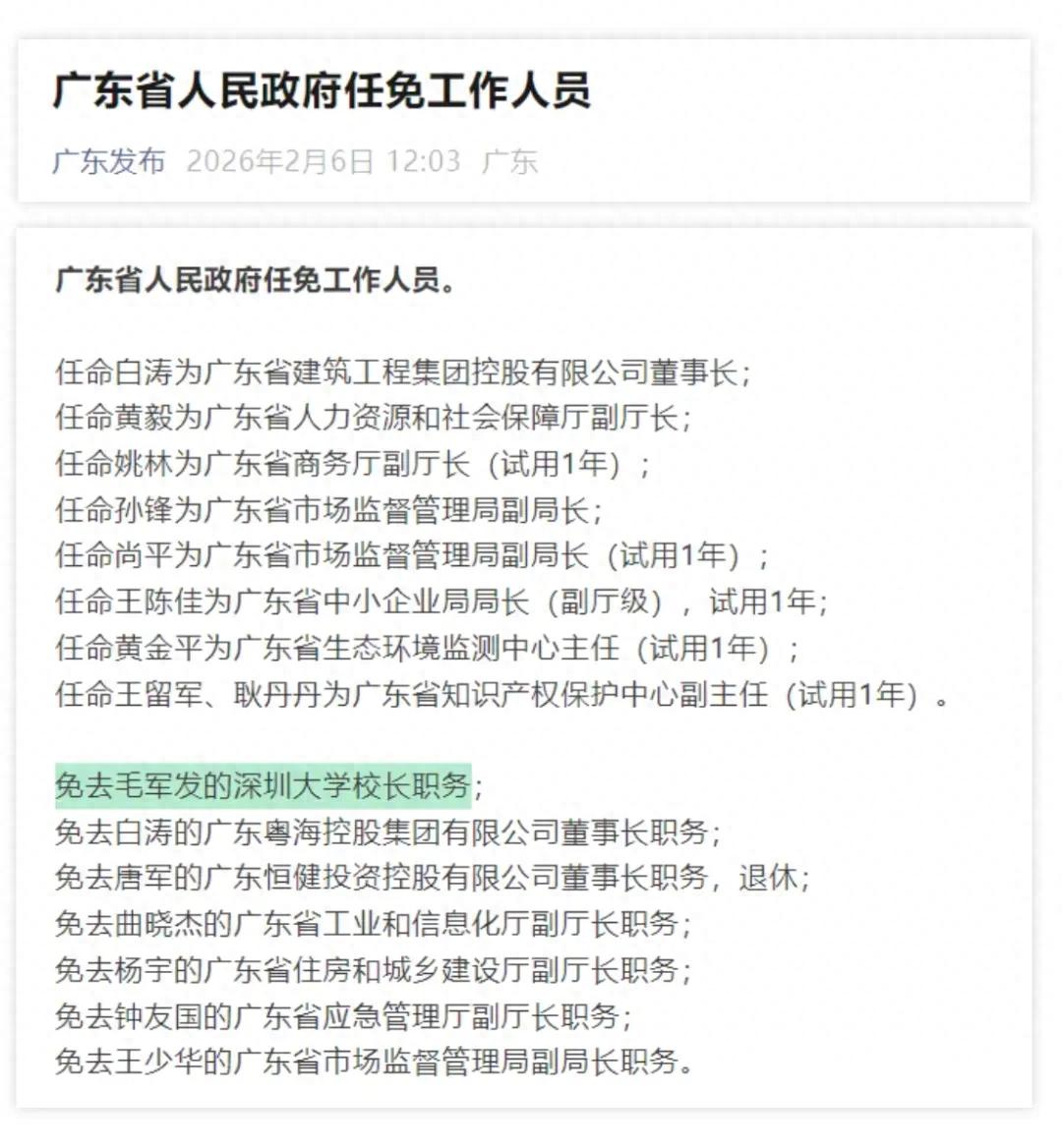 近日,广东省人民政府任免工作人员,免去毛军发的深圳大学校长职务。此前,中国工程院院士李清泉卸任深圳大学党委书记,徐波任深圳大学党委书记。