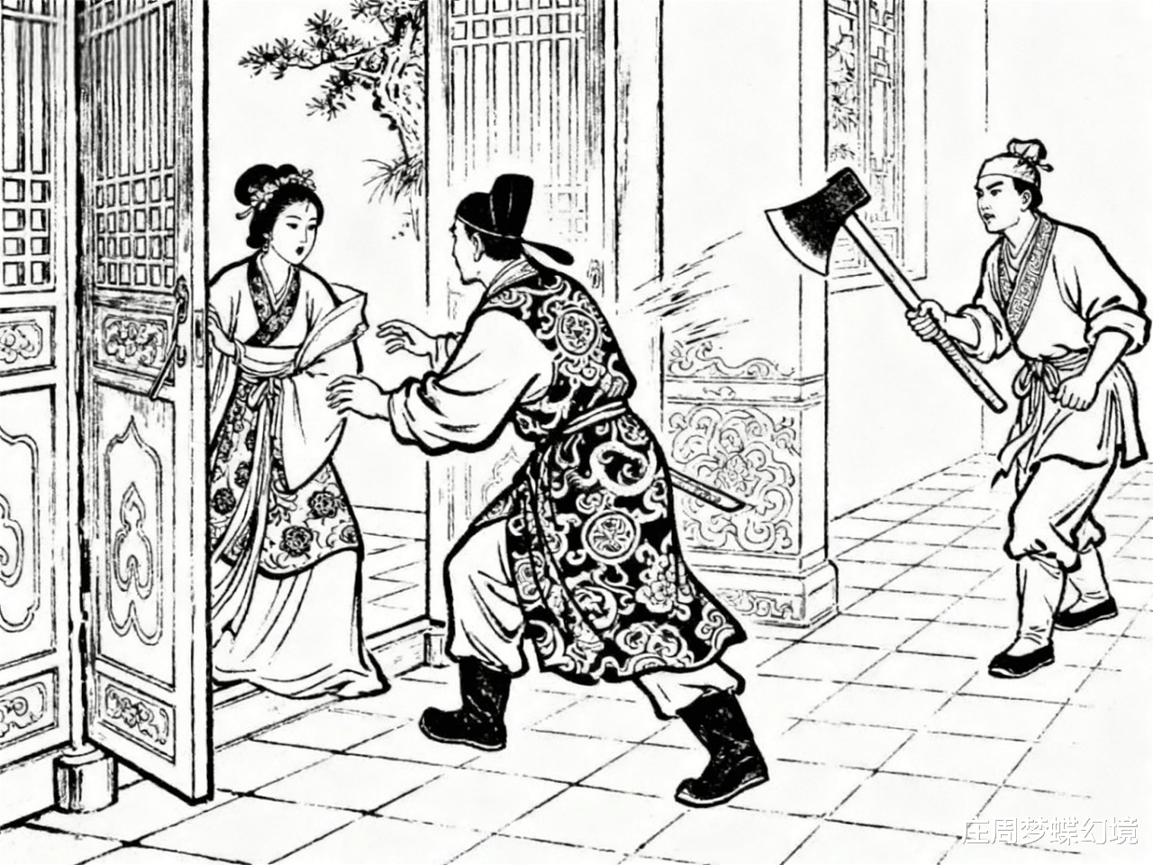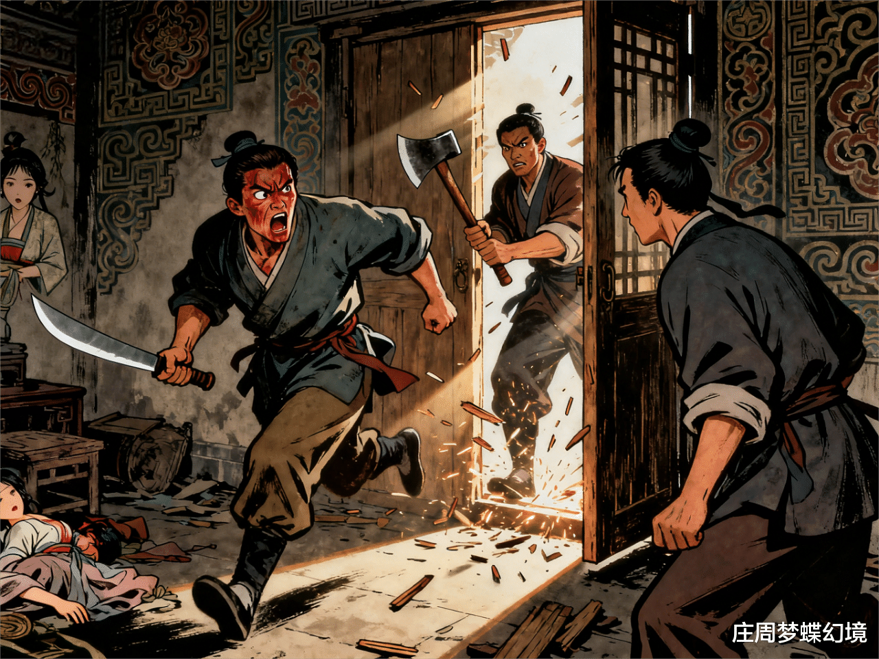 周生怒火中烧,想冲进去捉奸,又担心自己一个人打不过他们。他悄悄开门溜出去,飞奔到路边找成生求救。成生毫不犹豫地跟他回来,直奔卧室。周生举起石头砸门,屋里的人顿时慌作一团。砸门声越急,里面关得越紧。成生抽出剑,一剑就把门劈了开来。周生冲进去,那个仆人慌忙夺门而逃,成生在门外一剑砍中他,削断了他的肩膀和手臂。周生抓住妻子严刑拷问,才知道自己被抓进监狱后,她就和这个仆人私通了。周生借过成生的剑,砍下妻子的头,把她的肠子挂在院子里的树上,随后跟着成生离开了。