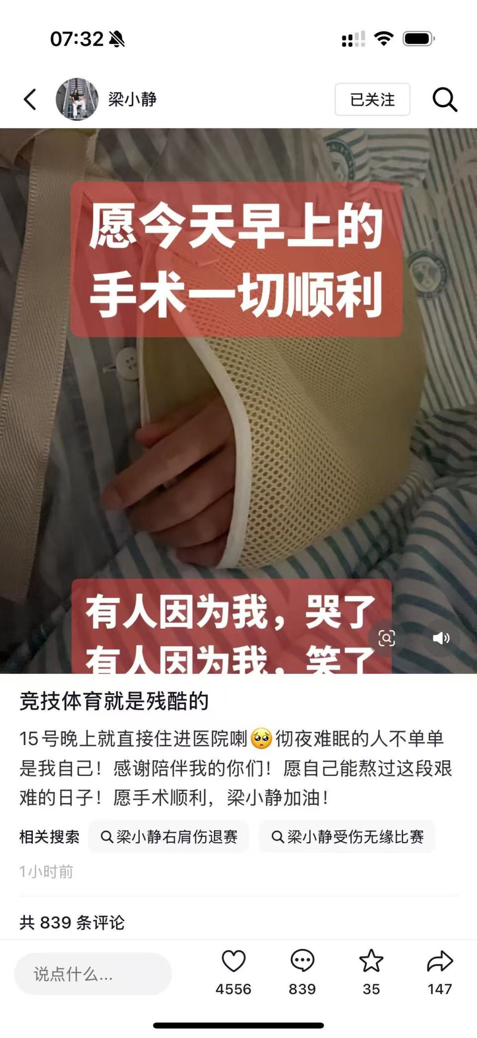 在最新的社媒内容里,梁小静还写道:“有人因为我,哭了;有人因为我,笑了。”她还写了一行字,“竞技体育就是残酷的”,还标了粗体,其中的滋味令人感慨万千。梁小静也因此退出了本届全运会,随后的比赛。