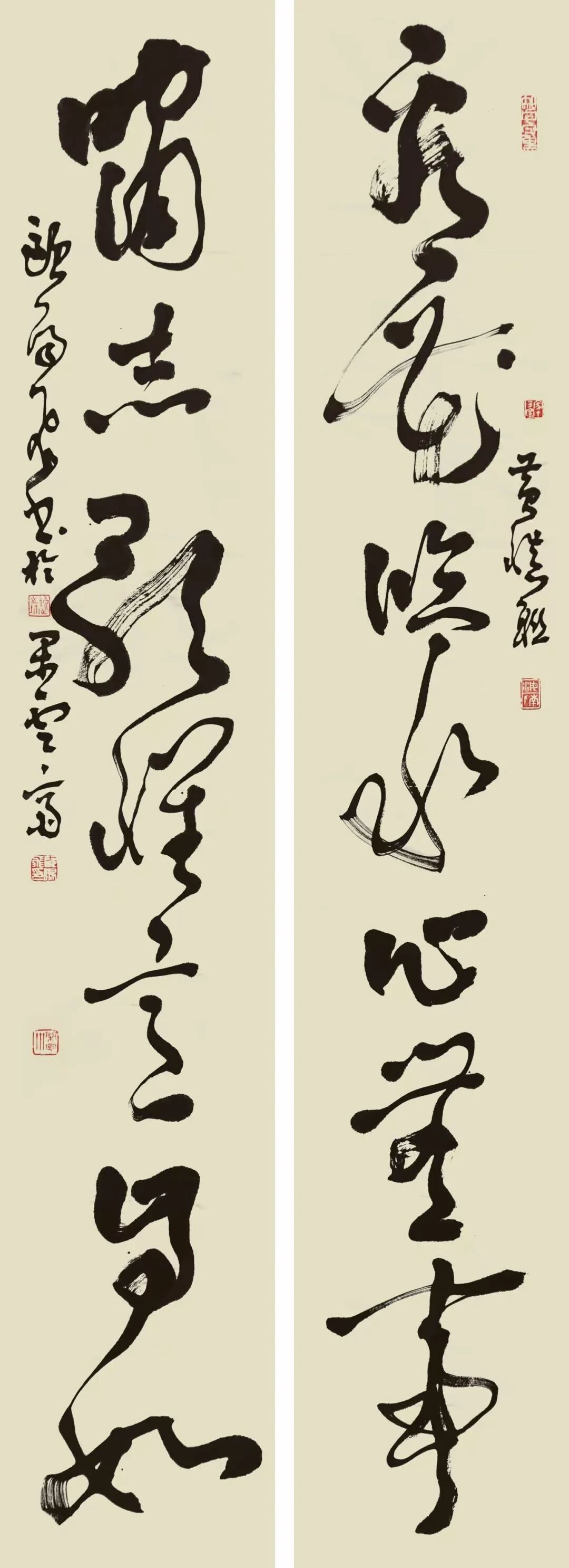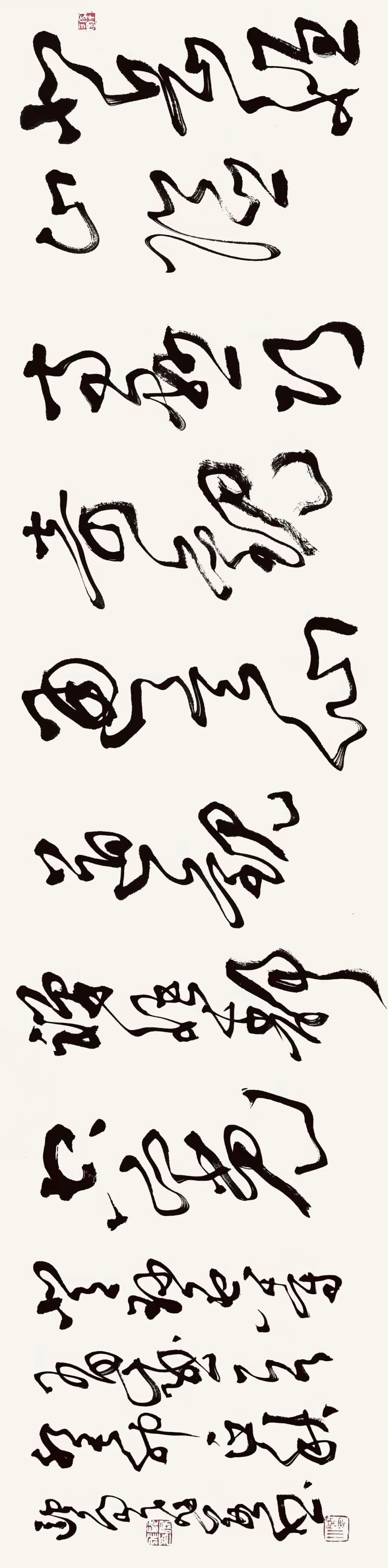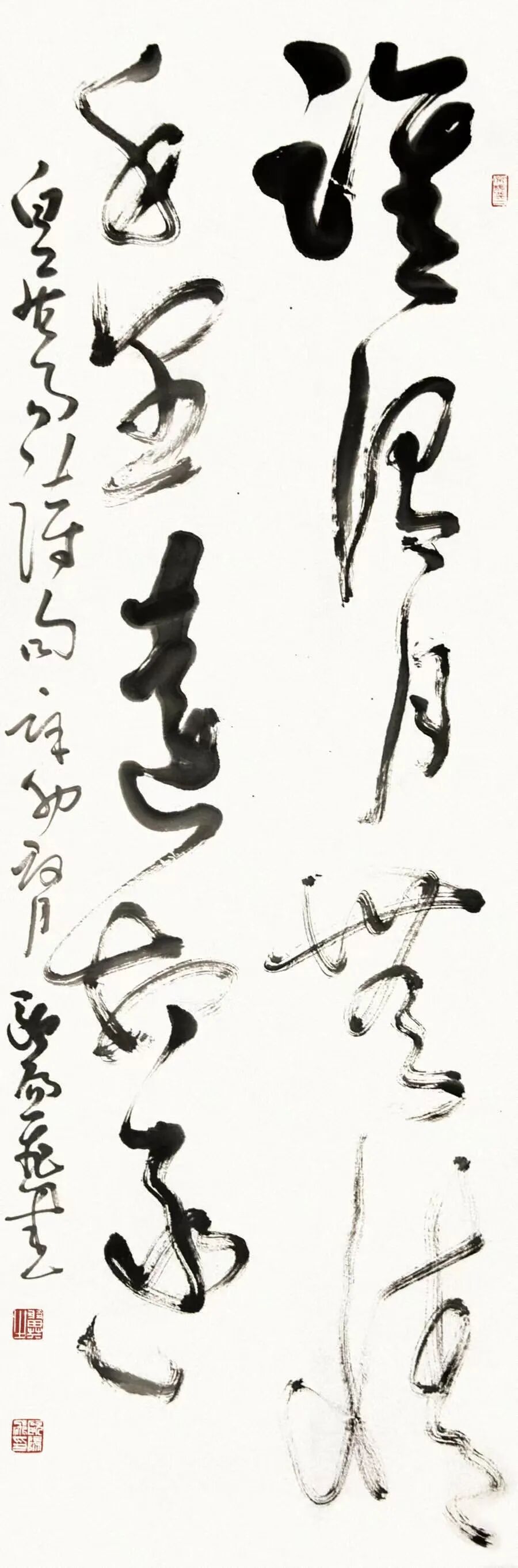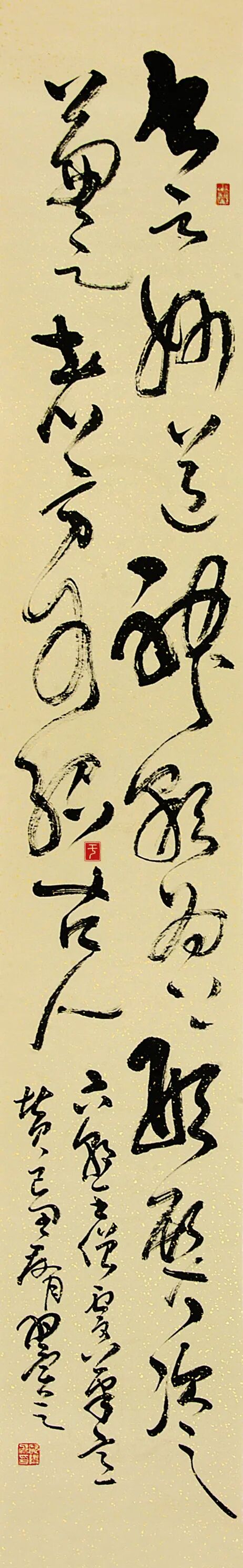 汉字乃象形文字,华夏五千年浩瀚璀璨的文明史,就是由汉字书写而成。汉字作为书写符号,其变迁大致可分为三个大的阶段,即汉字从天生的图形化阶段演变成方块化阶段再演绎到线条化阶段。其图案文字从原始的甲骨文、钟鼎文的图形文字到小篆、隶书的方块文字直至行楷书、草书,其三大阶段的基本形成年代大致上承殷商、西周(图形化)到秦、汉(方块化),最终由晋末的二王及隋唐两代(线条化)而完成。仅草书而言,经张芝、二王、贺知章、孙过庭到张旭已基本完成草书的写意内涵,唐人冲破了方块状文字的束缚,将点画转化为酣畅淋漓的线条化艺术,独立而自由地抒发着书家的内在思绪和精神趣味,通过笔下流畅的线条来述说书者心中汹涌澎湃的风骚情怀。而这种情感的倾述大多是以草书这种自由张扬,放浪形骸之外的写意线条来完成作者心中莫名的闷骚。