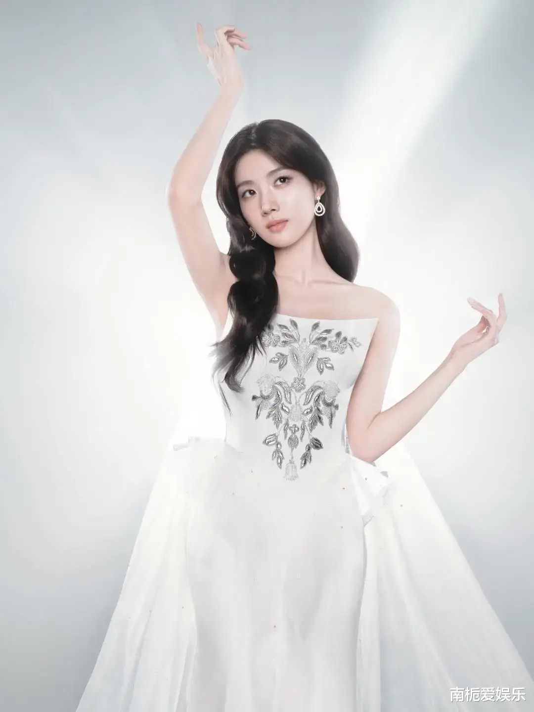 礼服的设计理念围绕“以光为丝,织就星河”展开,充满了诗意与巧思。纯白醋酸绸缎的抹胸长裙,面料哑光却不失质感,避免了廉价的反光感。裙身上手工缝制的细密水晶,在灯光下随着她的步伐流转微光。而胸口处点缀的银色“太空铃兰”刺绣,更是点睛之笔,巧妙地将科幻的未来感与古典的生命力融合在一起,赋予了造型独特的叙事感。
