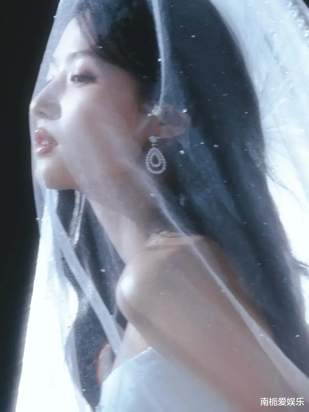 如果说礼服是基底,那么那顶斗笠式头纱则是整个造型的灵魂。它以竹编为骨架,覆盖上薄透的轻纱,并用碎钻勾勒轮廓,垂落时恰好半遮眉眼,营造出一种朦胧而神秘的疏离感。这种“犹抱琵琶半遮面”的东方留白美学,不仅完美契合了卢昱晓淡颜系的清冷气质,更让她在红毯上宛如一位从神话中走出的“月光神女”。