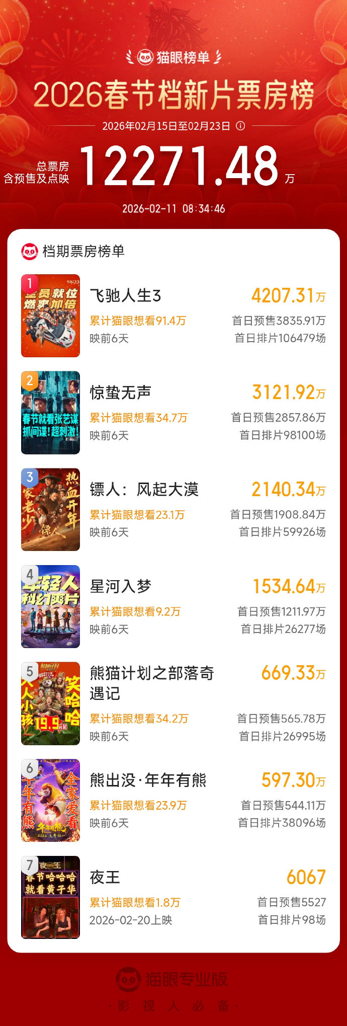 2026年春节档预售票房在28小时后,才突破1亿元,要知道2025年,春节档仅用6小时,总票房就已经破亿,这样的情况出现,大家为今年的春节档捏一把冷汗,因为大部分网友都在观望,哪部电影的口碑更好,才会选择去看哪部。