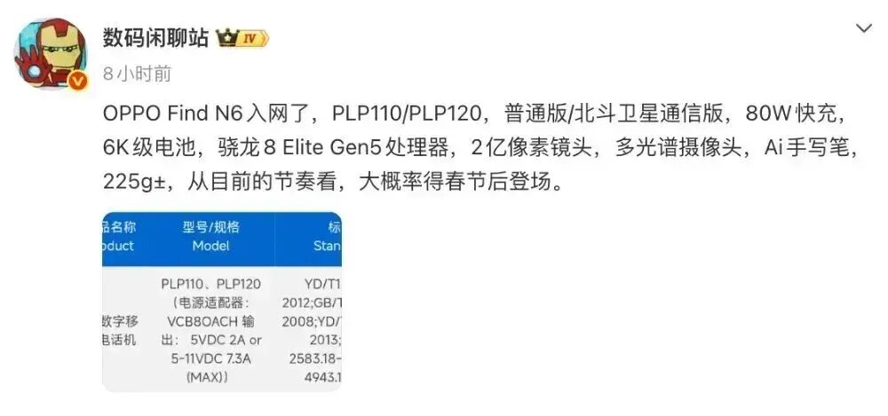 其他规格方面,OPPO Find N6或配备8.12英寸2K LTPO UTG主屏、6.62英寸副屏,核心搭载骁龙8 Elite Gen5,电池为2700mAh+3150mAh=5850mAh/6000mAh±Typ,有北斗卫通版,12GB/16GB+1TB存储规格,提供原钛色、深黑色、金橙色等可选配色,整机重量为225g±。