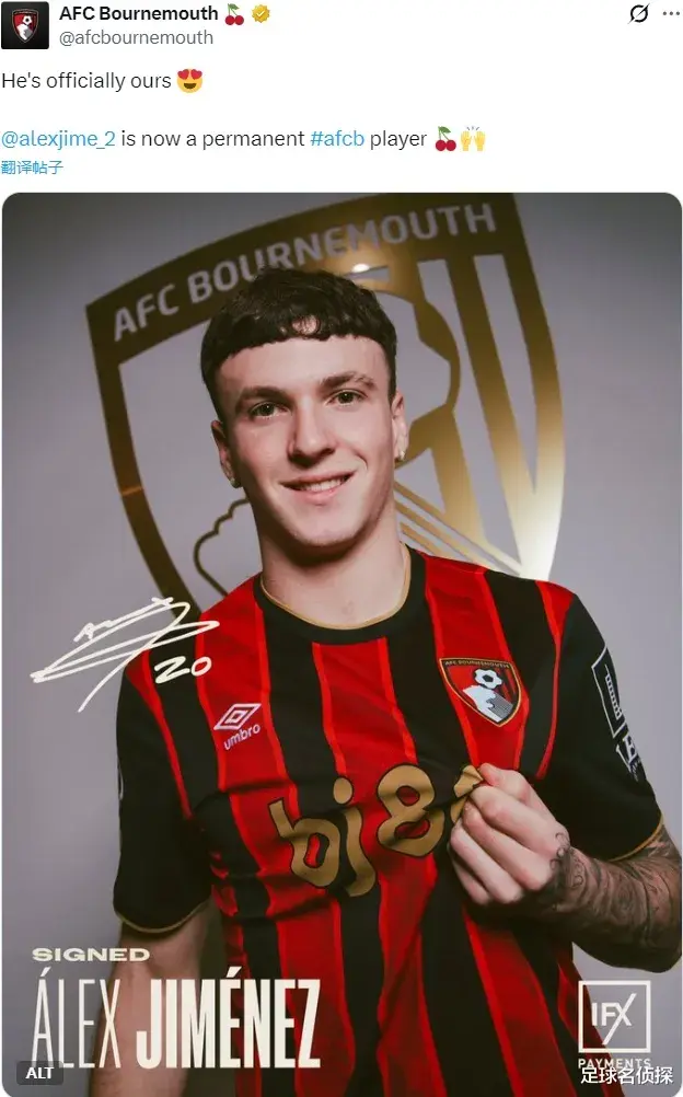 官方:伯恩茅斯宣布从米兰买断了亚历克斯-希门尼斯。