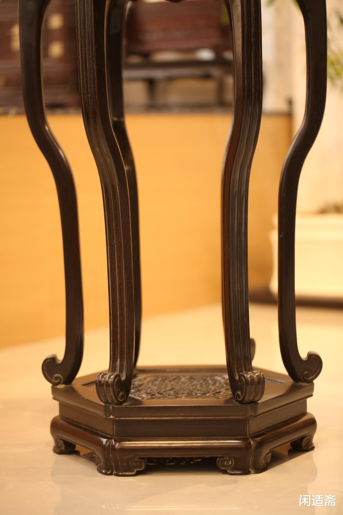 器型设计极具宫廷特色,六足外翻呈流畅的“S”形曲线,线条婉转灵动、弧度自然,打破了传统香几的规整沉闷,尽显宫廷器物的灵动雅致。六足造型既增强了香几的稳定性,又让整体器型更显舒展大气,尽显工匠的精湛技艺。