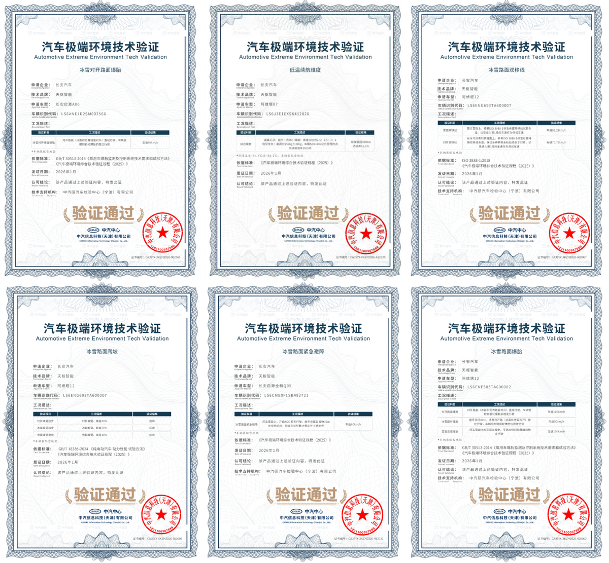 具体来看,在同级独有的分布式电驱系统和智能动态扭矩控制技术加持下,阿维塔 12在雪面及冰雪对开路面双移线测试中,分别以 92.3km/h 和70.7km/h的速度变道不偏移、稳健通过验证,居行业测试记录第一,大幅提升用户在极端路况下的安全避障能力;天枢智能爆胎稳行系统,让长安启源 A06 在冰雪对开路面上实现 95km/h 高速爆胎稳定行驶,同级第一,相关功能将于年内OTA推送;首创零耗电触媒续航增强技术,如同给车辆配了一个可插拔的“自热暖宝宝”,使阿维塔07低温续航里程达成率提升至61.2%,行业第一;阿维塔12冰雪路面爬坡,凭借脉冲脱困和四轮驱动力矢量控制技术,让车辆在冬季冰雪坡道场景如履平地,毫秒间脱离困境;同时还有阿维塔12全场景爆胎无感以及长安启源全新Q05冰雪路面紧急避障等一系列测试,均通过了中汽中心汽车极端环境技术验证。