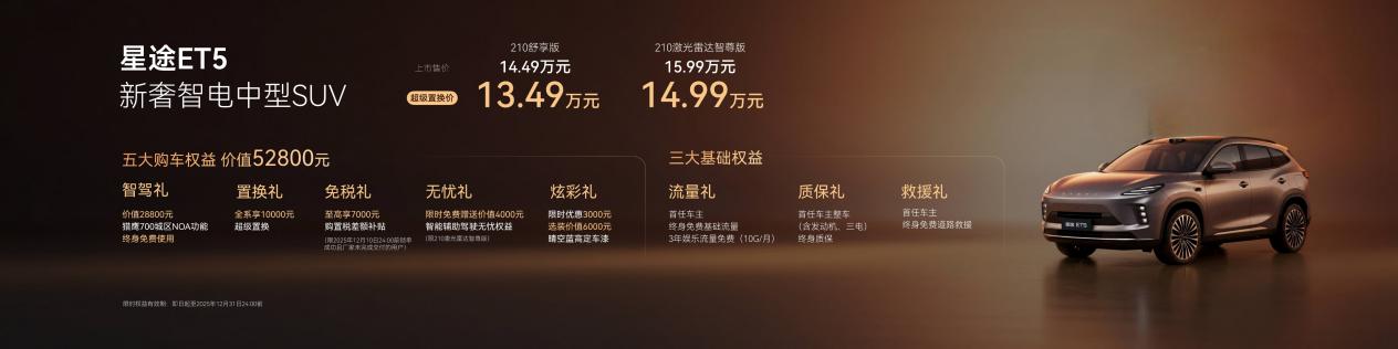 11月28日,星途ET5。新车共推出210舒享版、210激光雷达智尊版两款配置,官方指导价14.49万-15.99万,超级置换价13.49万-14.99万,也就是说相比预售价的15.99万、17.49万,拿到手的价格下调了2.5万,这个幅度是不小的,权益方面还包含了猎鹰700城区NOA功能终身免费使用等权益。