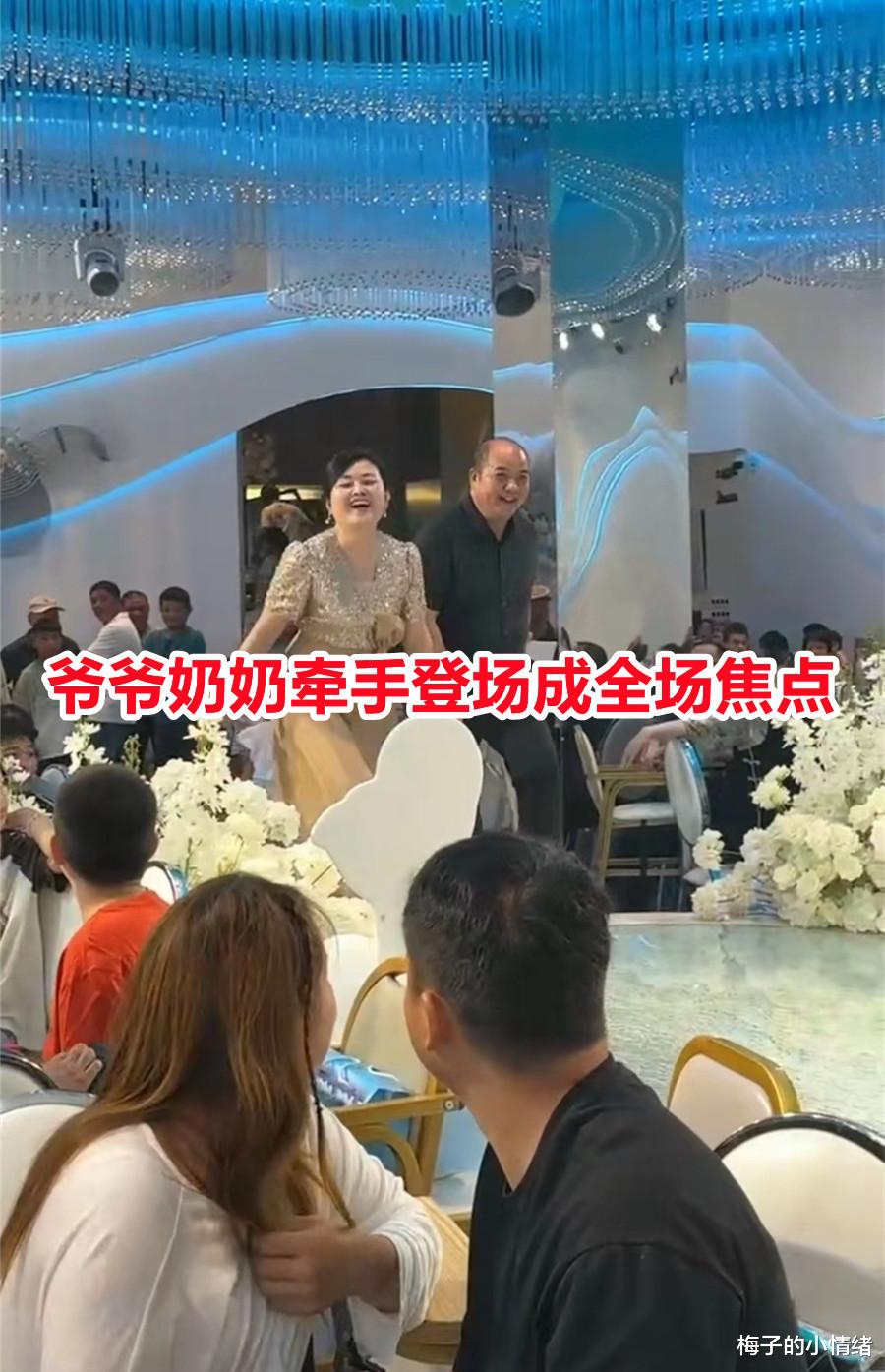 满月宴选在一处挂满水晶灯的大厅举行,现场宾客满座非常热闹,而爷爷奶奶这边上台时全程十指紧扣、恩爱有加,从现场的布置和两个人甜蜜的举止来看,还以为他们是在庆祝结婚纪念日。
