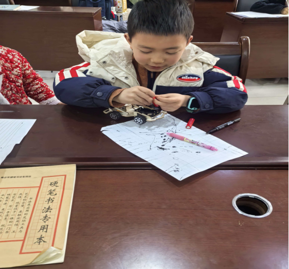 最让孩子们兴奋的,莫过于 “小红车” 模型搭建环节!志愿者们为孩子们分发简易小车搭建材料,大家两两协作、动手拼装,从拼接车架到安装车轮,每一个步骤都认真专注。姚老师和志愿者们在旁耐心指导,及时解答孩子们的疑问,鼓励大家大胆尝试。当一辆辆小巧的 “小车” 成功搭建完成,孩子们捧着自己的作品互相展示、欢呼分享,满满的成就感写在脸上,协作意识与动手能力也在实践中悄悄提升。