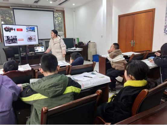活动伊始,姚老师以 “汽车的前世今生” 为主题展开分享,用生动的图文和趣味讲解,带孩子们穿越时空,认识从蒸汽机车、燃油汽车到现代新能源汽车的发展历程。从烧煤的 “移动锅炉” 到烧油的常规汽车,再到零排放的新能源汽车,孩子们听得目不转睛,在趣味讲解中读懂汽车动力的进化脉络,更理解了这种变化背后守护环境、践行低碳生活的深远意义 —— 新能源汽车的出现,不仅是科技进步的体现,更是我们守护蓝天、守护家园的重要方式,让绿色环保的理念在潜移默化中扎根孩子们心中,也让每一位孩子都感受到科技创新赋能生活、助力生态保护的力量,主动探索、积极思考的热情被彻底点燃。