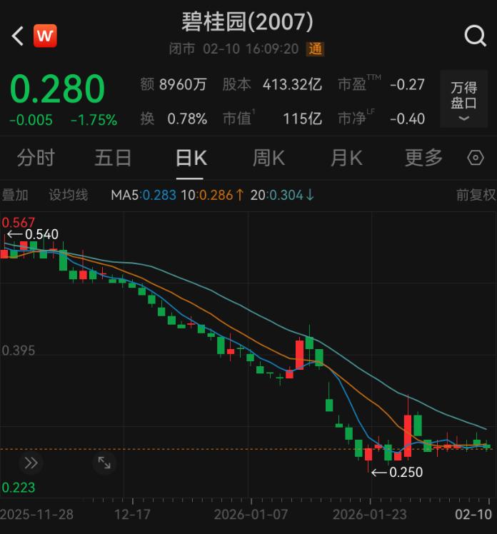 2月10日,碧桂园收跌1.75%,每股报0.28港元, 较2018年巅峰时最高每股16.762港元(前复权),已下跌98%,目前总市值115亿港元。
