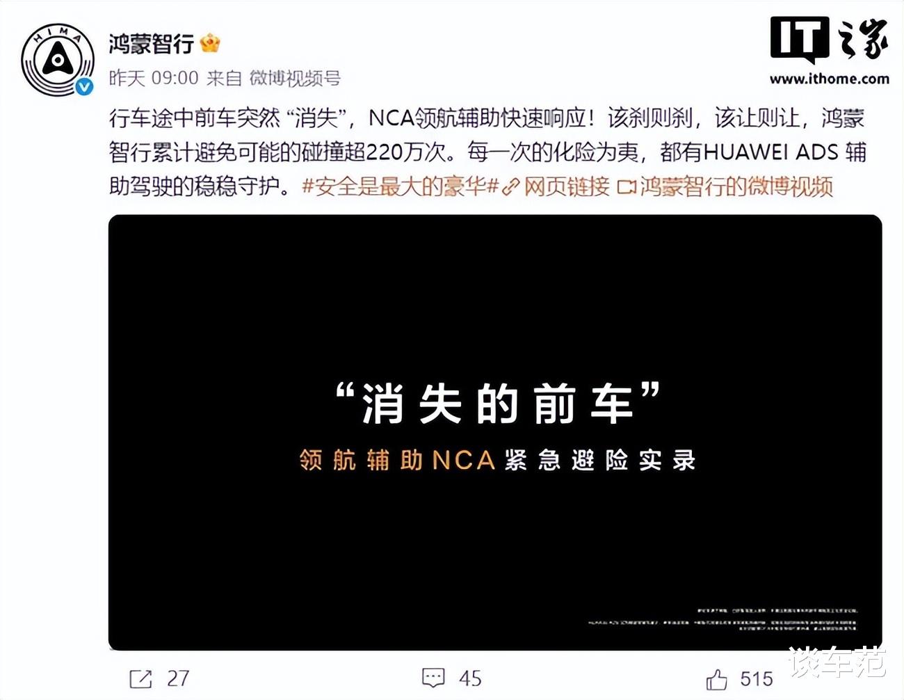 决策与执行能力同样是安全体系的关键环节。近期备受关注的“消失的前车”测试场景中,前车因视觉遮挡突然消失,留给后车的反应时间极短。华为乾崑智驾ADS 4的应对策略是“该刹则刹,该让则让”,在AEB无法完全避免碰撞时启动横向避让。据统计,基于此类精准避险机制,鸿蒙智行已累计避免242万次潜在碰撞。这种能力不仅源于技术积累,更体现出系统在实时判断与多方案择优上的成熟度。