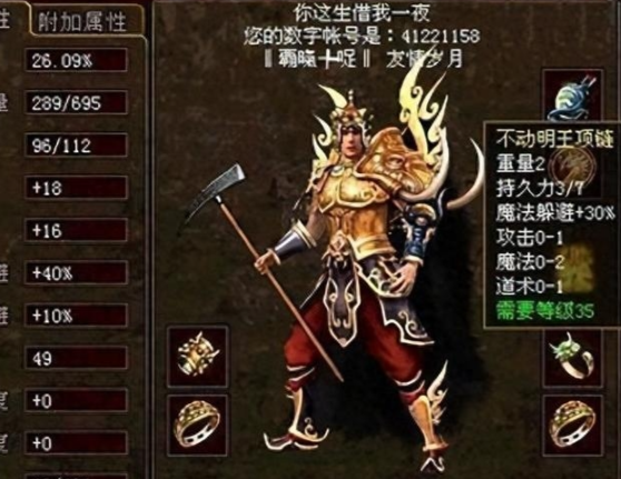 不动明王项链则走出了 “防御 + 全能” 的独特路线。作为以防御著称的不动明王套核心,这条极品项链拥有 40% 魔法躲避,更罕见地对三职业属性均有加成,攻防一体的特性让它成为混战神器。它的传奇经历堪比武侠小说:最初归 15 区大佬腾龙所有,这位 “特戒批发商” 因这件装备遭 “屠龙军团” 大规模围攻,激战中项链被爆,最终落入对手星月皇后手中,一场装备争夺直接改写了区服势力格局。相较于虎齿的极端克制和神武的暴力输出,这条项链的全能属性,让它成为跨职业通用的神器。