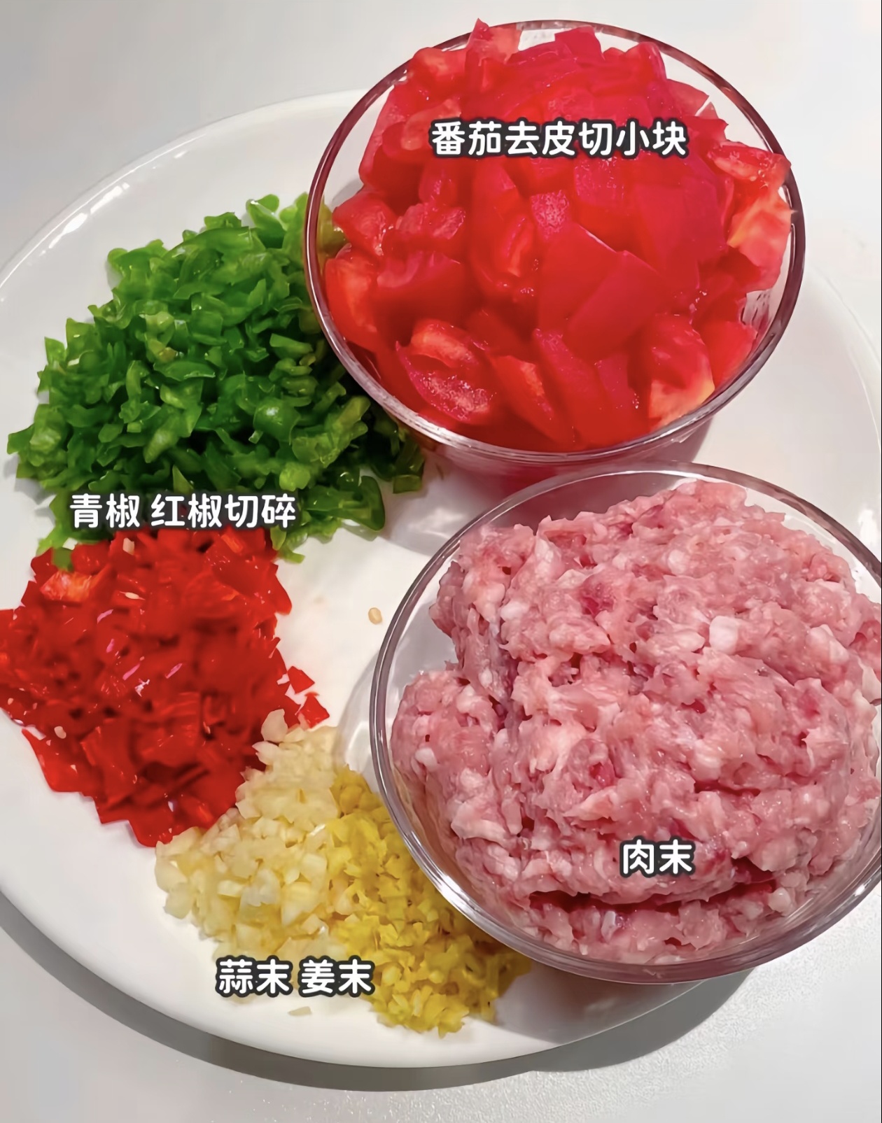 先把肉末腌制一下,加一勺料酒、半勺盐和蒜末,抓匀后腌制10分钟。这一步不仅能去除肉的腥味,还能让肉末更入味。接着处理番茄,用开水烫10秒,番茄皮就会轻松脱落,然后切成小丁。红椒和小米辣也切成碎末备用。一切准备就绪,就可以开火了。